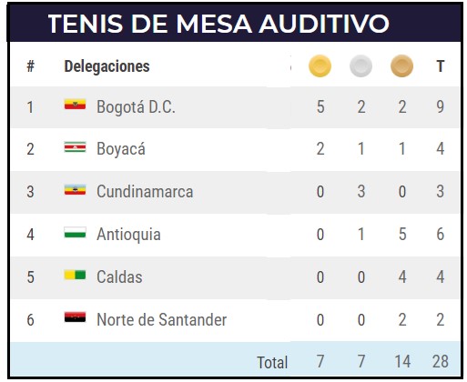 En el tenis de mesas auditivo femenino, modalidad sencillos, Angie Lizeth Bedoya Bravo ganó la última medalla de esta disciplina para Cundinamarca, delegación que en el medallero general ocupó la tercera posición luego de sumar un total de tres medallas de plata. Las otras dos las obtuvieron en equipos femenino y dobles femenino.