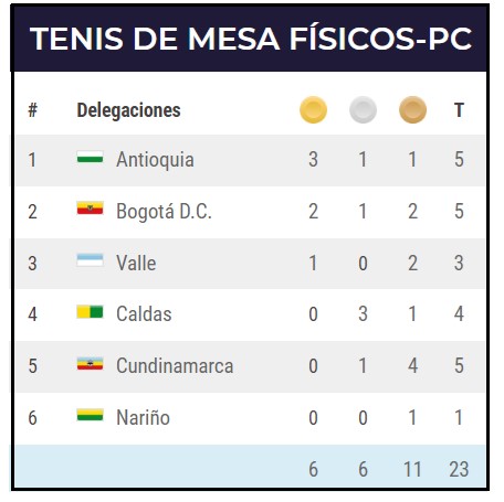 En tenis de mesa físicos-pc, Cundinamarca sumó un total de cinco medallas: 1 de plata y 4 de bronce, modalidad que fue dominada por la delegación de Antioquia.